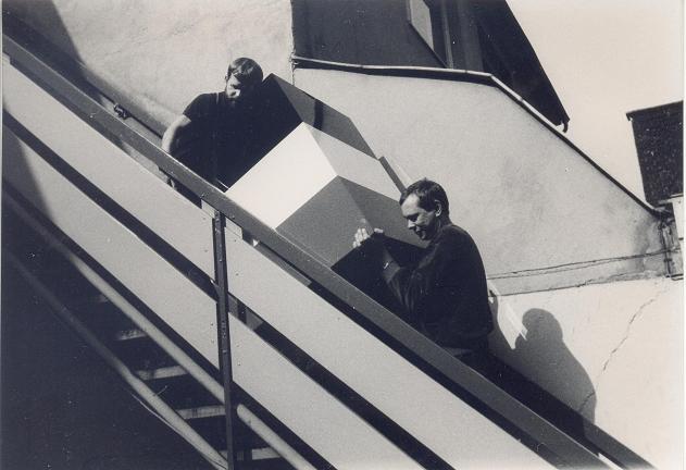 Fritz Klingbeil und Peter Kerschgens beim Transport einer Klingbeil-Plastik in Düsseldorf